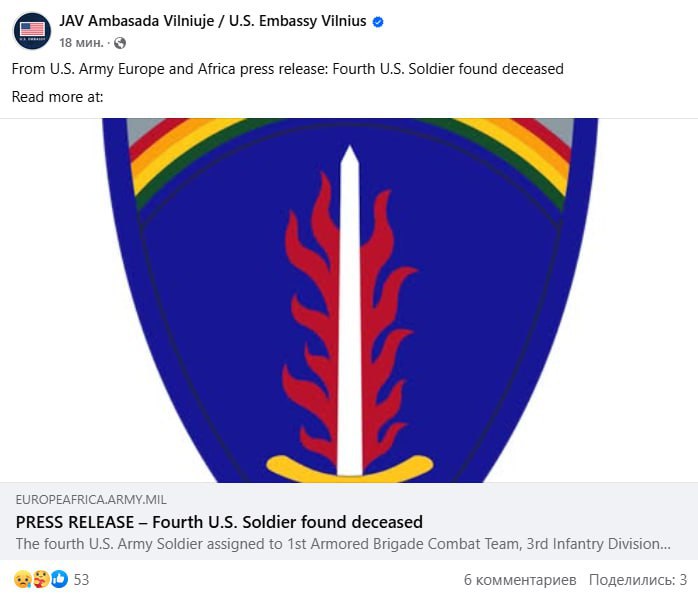 «Четвертый военнослужащий армии США (...) найден мертвым недалеко от Пабраде, в Литве, 1 апреля», — говорится в распространенном во вторник заявлении.