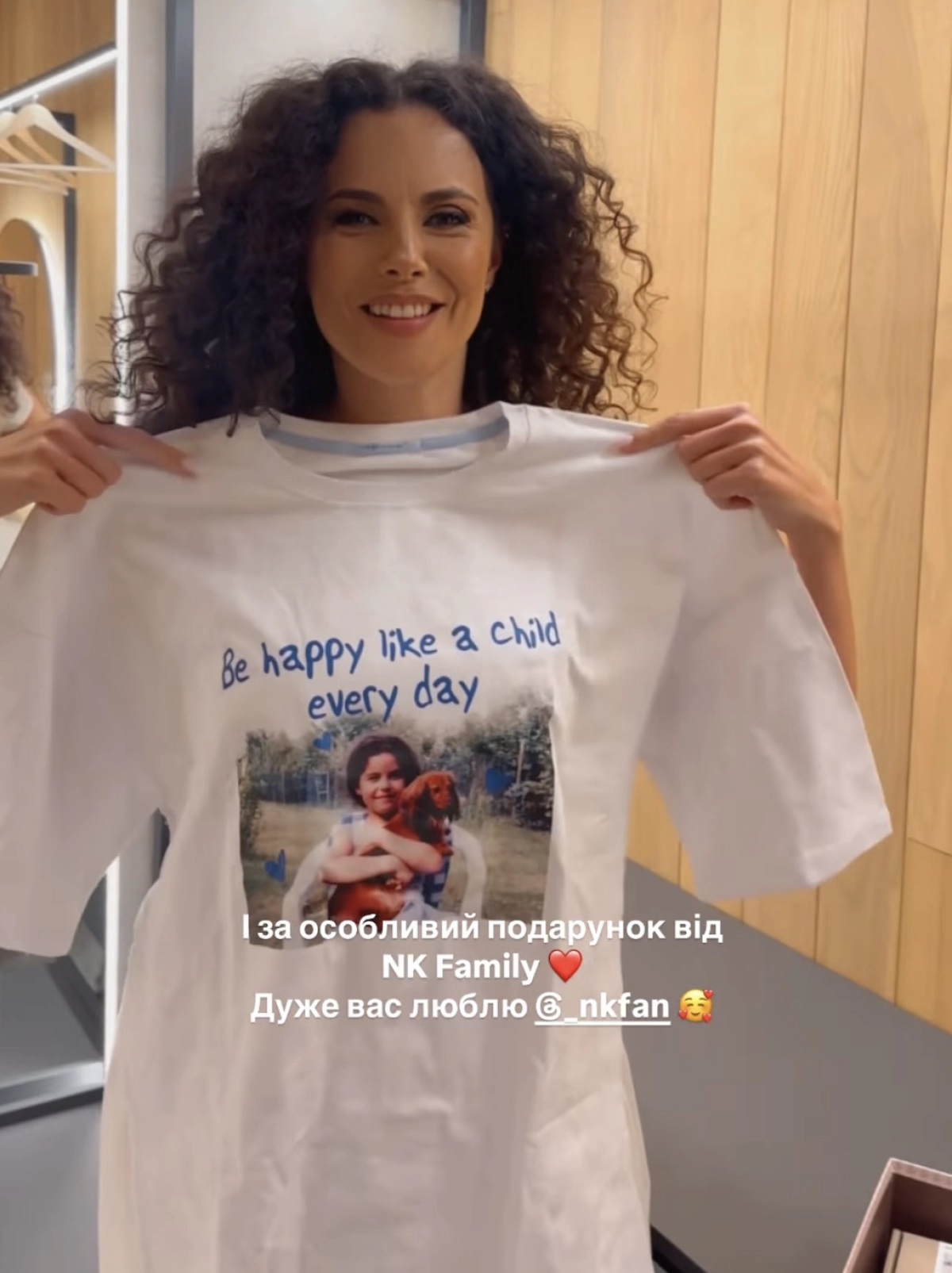 Внутри была футболка с детским фото артистки и надписью "Be happy like a child every day", что на русский переводится как "Будь счастливой, как ребенок, каждый день".