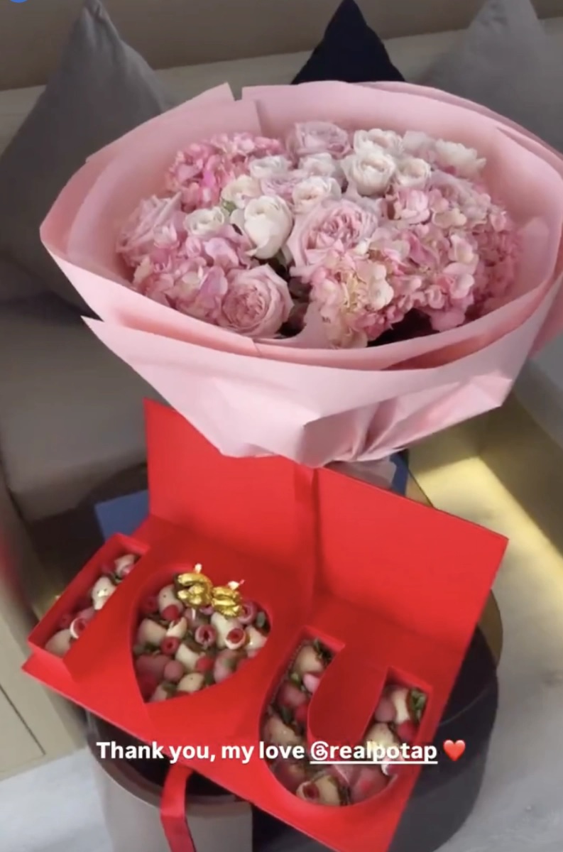 Певица показала и подарок от своего мужа, известного под псевдонимом Потап. Звездный рэпер и продюсер порадовал любимую букетом в розово-белых тонах из роз и гортензий, а также, возможно, ранункулюсов или пионов. Его дополнили сладости — ягоды в шоколаде, в частности малина и клубника. Их положили в красную коробку в форме сердца и украсили свечами в форме праздничных шариков к 38-летию.