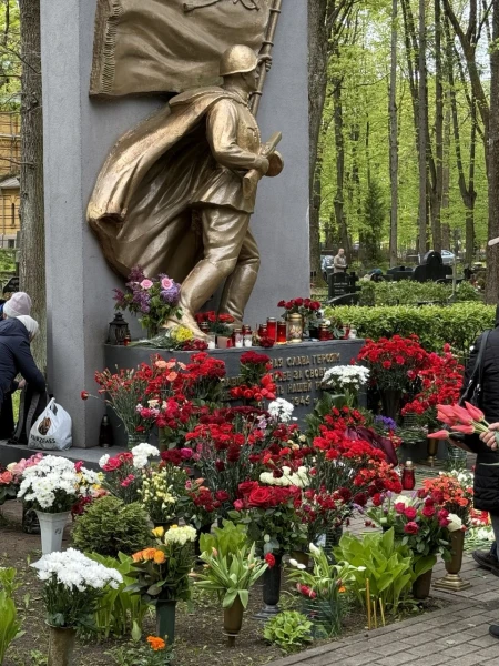 Сегодня Воинское захоронение на Покровском кладбище в Риге, как обычно, покрыто цветами. Поток людей с гвоздиками, розами, тюльпанами не ослабевает. Среди пришедших есть и молодые люди.
