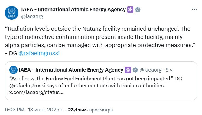 ДОПОЛНЕНО: МАГАТЭ заявило о наличии радиоактивного загрязнения внутри ядерного объекта в Натанзе, куда сегодня нанес удар Израиль.