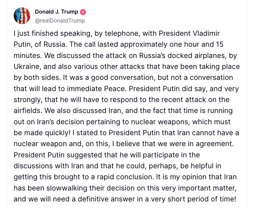 Мы говорили и об Иране, и о том, что время на решение Ирана по ядерному оружию истекает, и оно должно быть принято быстро! Я заявил президенту Путину, что у Ирана не может быть ядерного оружия, и в этом я считаю, что мы были согласны. Президент Путин предположил, что он примет участие в переговорах с Ираном и, возможно, будет полезен в скорейшем их завершении. По моему мнению, Иран медлит с принятием решения по этому очень важному вопросу, и нам понадобится окончательный ответ в очень короткий период времени!", - написал Трамп.