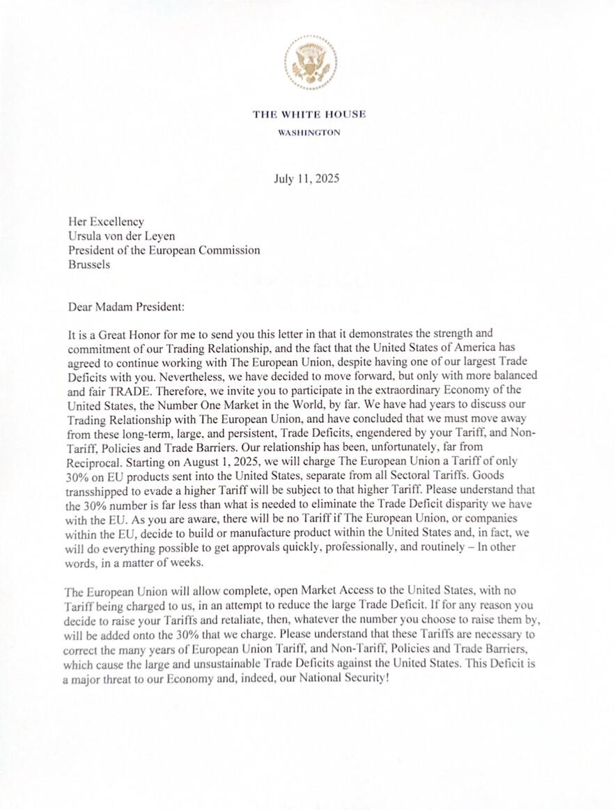 "У нас были годы для обсуждения наших торговых отношений с Европейским союзом, и мы пришли к выводу, что нам необходимо уйти от этого долгосрочного, значительного и постоянного дефицита в торговле, порожденного вашей тарифной и нетарифной политикой, а также торговыми барьерами. Наши отношения, к сожалению, далеки от взаимных", – написал Трамп в письме ЕС, не исключив при этом возможности продолжения переговоров.